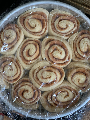 For the filling: Spread the butter very thinly with an offset spatula along the top of the rolled out dough. This doesn't have to be perfect. Mix the sugar and cinnamon in a bowl, and then sprinkle an even layer across the buttered dough. Roll the dough inwards, forming a 24-inch long pinwheel. Cut the dough in half, and then each half into five equal rolls. Place in a lightly greased pan with a small amount of room around them. These can be baked in many different shaped pans, but they should be close enough that they start to touch when proofing.